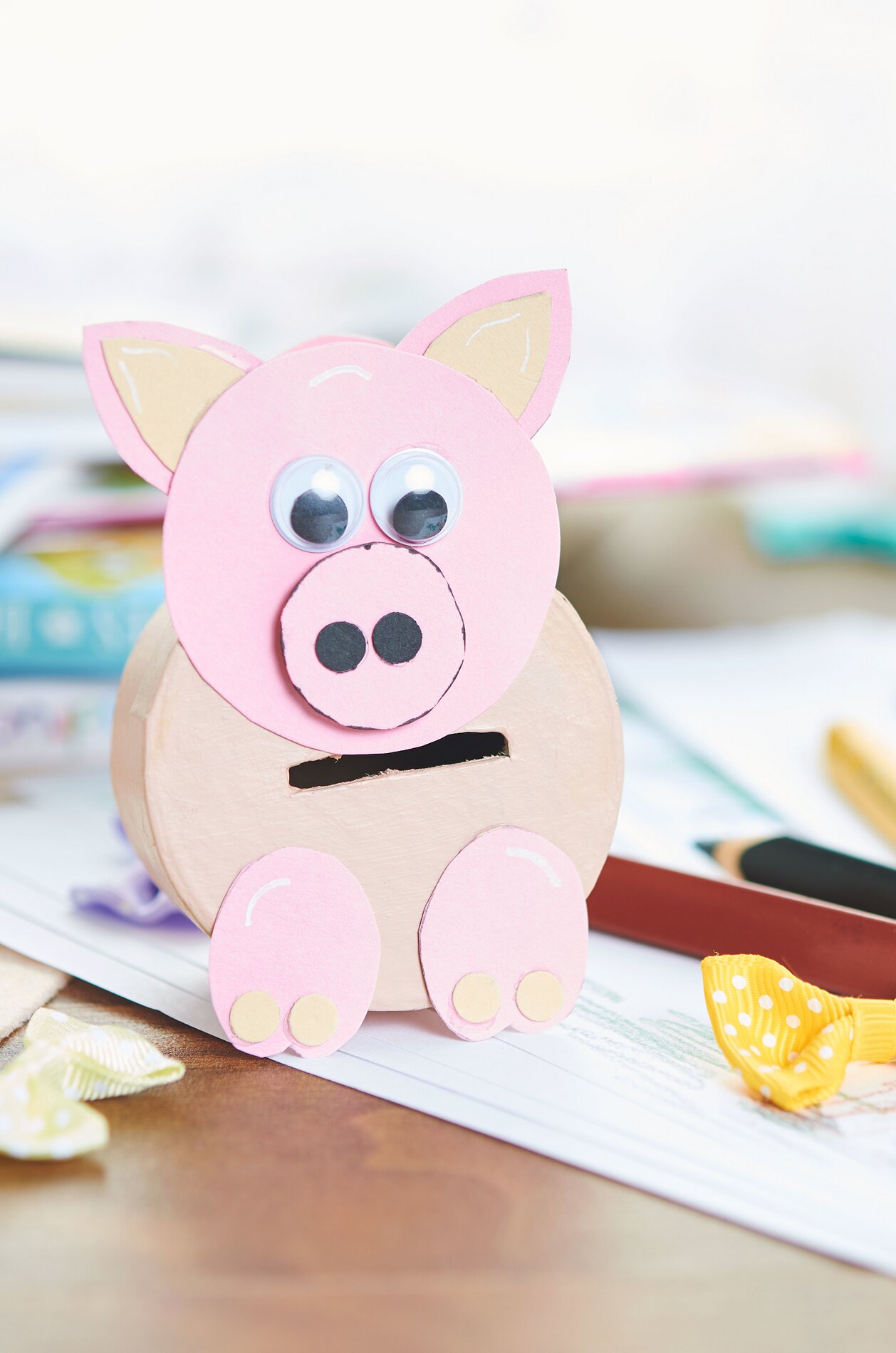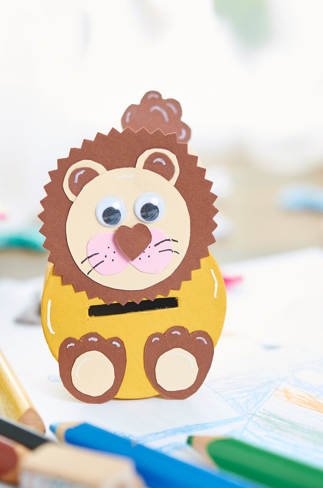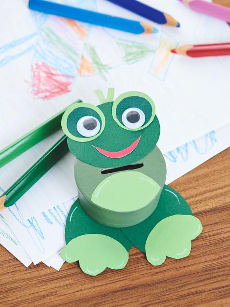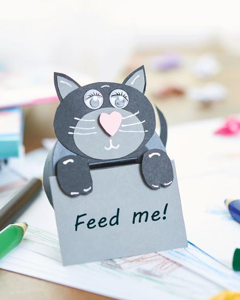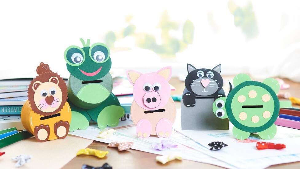 Chcete-li vyrobit hlavy a tlapky, stáhněte si šablonu s motivem, přeneste jednotlivé tvary na barevný papír nebo fotopapír a vystřihněte je. Nyní jednotlivé části motivu slepte k sobě a poté je připevněte k pokladničce na peníze.