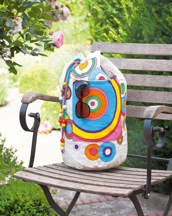 Do tašky vložte kousek kartonu jako dělicí příčku a na tašku nakreslete kružítka pomocí kružítka, která vybarvíte fixy POSCA.