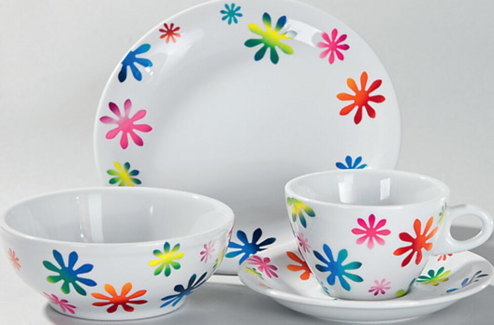 Dekorační fólie s módním barevným gradientem lze snadno děrovat nebo řezat a aplikovat na porcelán. Po zapečení v troubě lze pak nové veselé nádobí bez obav ručně umýt.