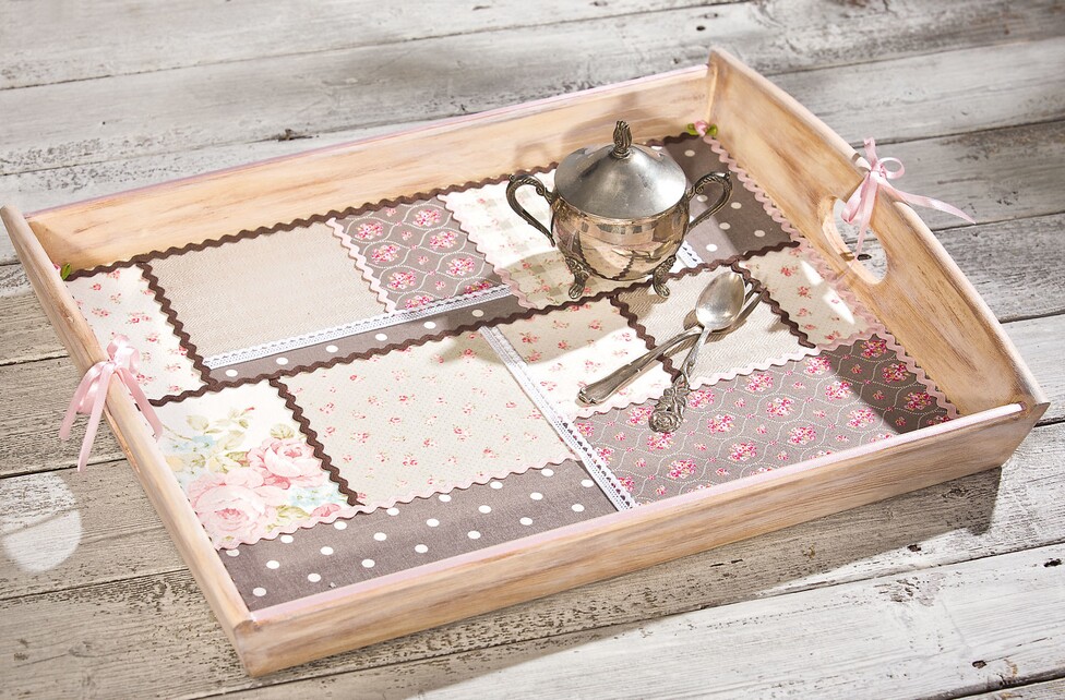Nyní vytvořte patchworkový vzor z různých látek a jednotlivé kousky nastříhejte nůžkami na látky na požadovanou velikost. Základnu podnosu natřete tenkou vrstvou lepidla na dřevo, položte na ni vystřižené kousky a pevně je přitlačte.