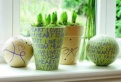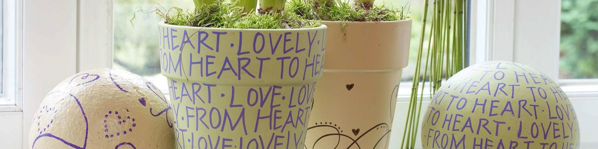 Nápisy a vzory přeneste na hliněné květináče a ozdobné baňky pomocí samopropisovacího papíru a tužky. Nakonec motivy obkreslete matným fixem na barvy edding 4000.