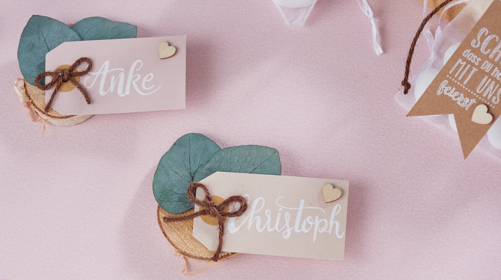 Chcete-li obnovit vzhled jmenovek, nalepte na visačky pomocí trochy řemeslného lepidla eukalyptové listy a posypové srdíčko. Po zaschnutí odstřihněte kousek jutové šňůrky a protáhněte ji otvorem.