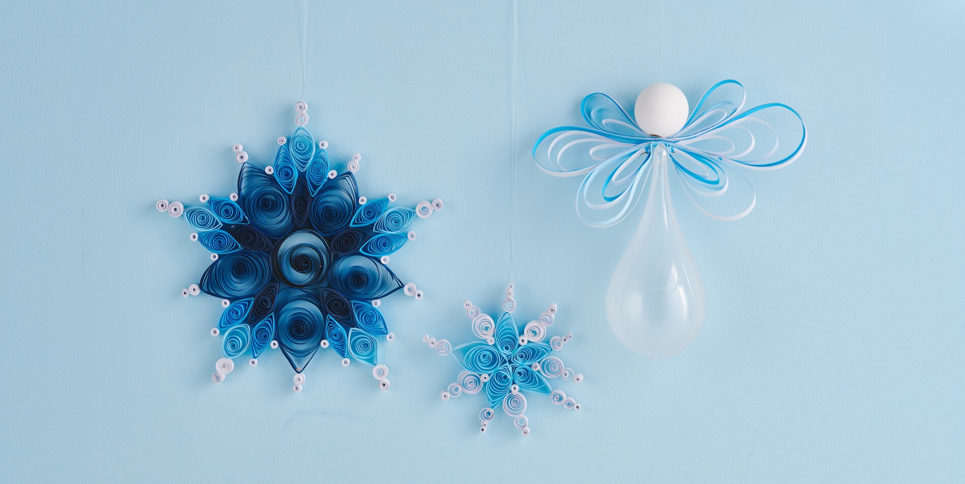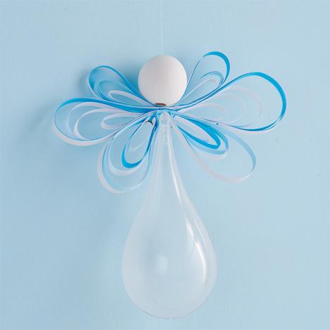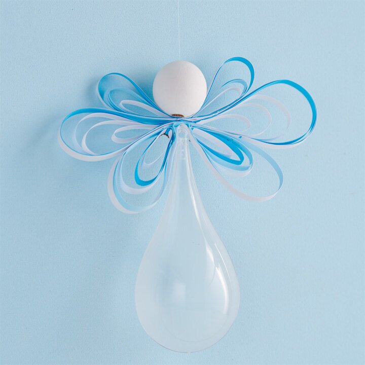Nylonovou nit zauzlujte do závěsného poutka. Konec navlékněte do jehly. Jehlu prostrčte středem křídel a poté zatáhněte za dřevěnou kuličku. Konec nitě zauzlujte do smyčky.