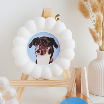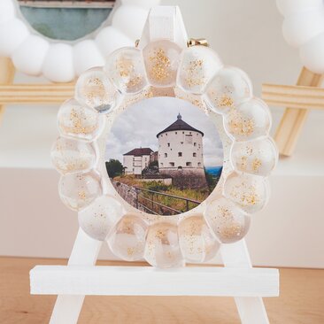 Kombinace licí pryskyřice s bílou kreativní licí hmotou Formu je také možné vyplnit nejprve licí pryskyřicí a poté Keraflottem nebo naopak, podle toho, jakého výsledku chcete dosáhnout. A samozřejmě můžete také vyrobit rámeček na obrázek pouze z bílé kreativní odlévací hmoty a poté jej přilepit na střed odlitku pomocí oboustranné lepicí pásky.