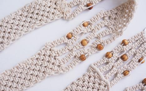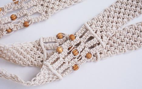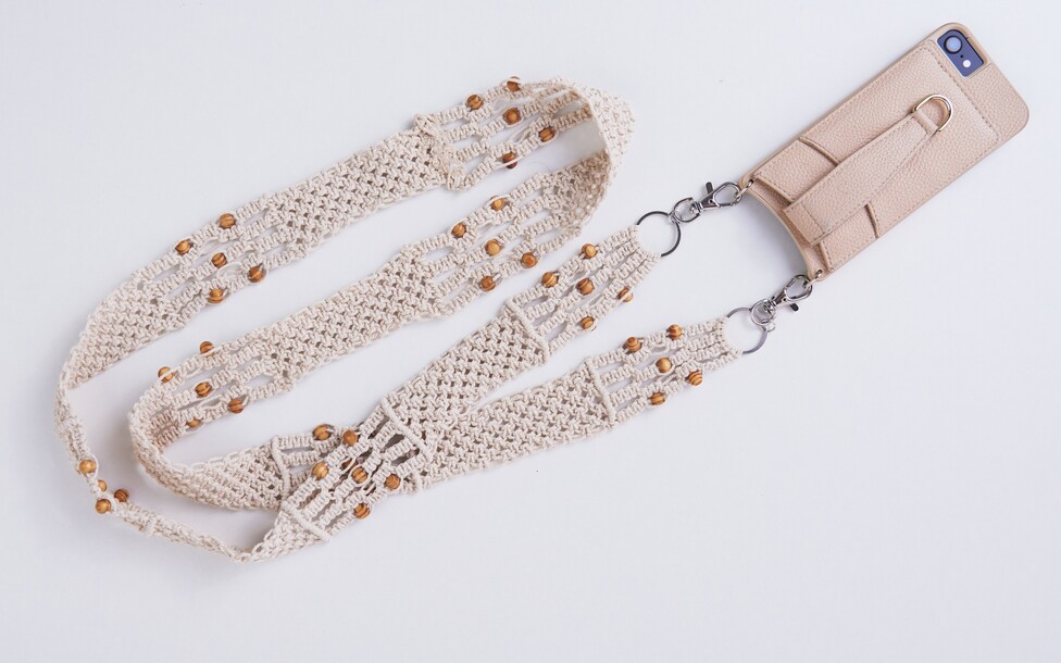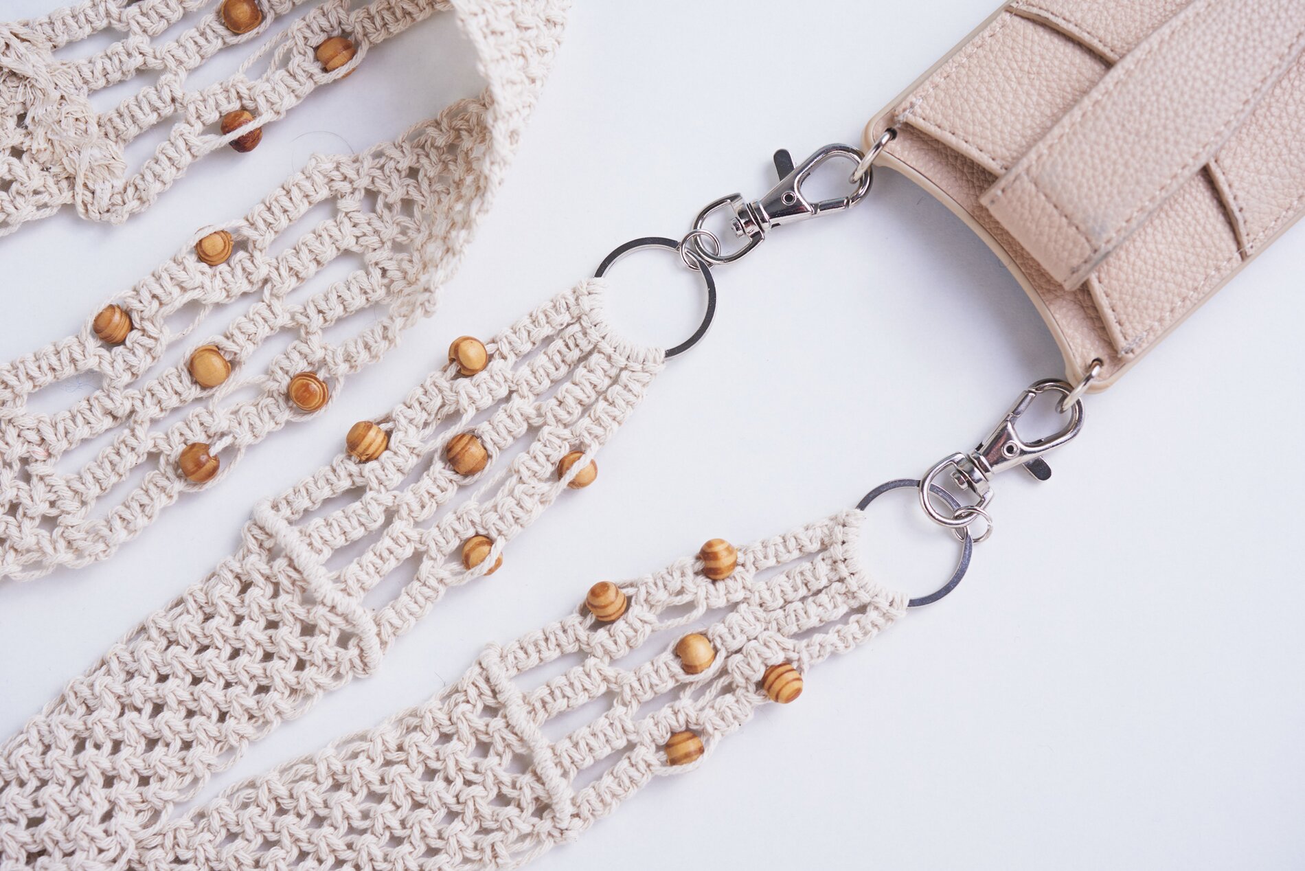 Díl A uvažte podle šablony macramé křížovými uzly. Řada vodorovných žebrových uzlů odděluje první uzlovací vzor od druhého dílu B. Uzlování opakujte, dokud nebudete mít dostatečně dlouhý řetízek na mobilní telefon. U druhého kroužku na klíče začněte také uvázáním uzlu se skřivánčí hlavou a vzor chvíli uvažujte.