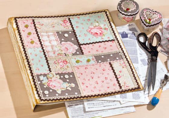 Na obal kroužkového pořadače naneste tenkou vrstvu lepidla na dřevo a nalepte na něj hotovou patchworkovou látku. Pevně ji přitiskněte. Nakonec přilepte pomocí pásky paličkovanou krajku a klikaté stuhy. Pěkně také vypadá, když připevníte také jednotlivé knoflíky a velké látkové květy.
