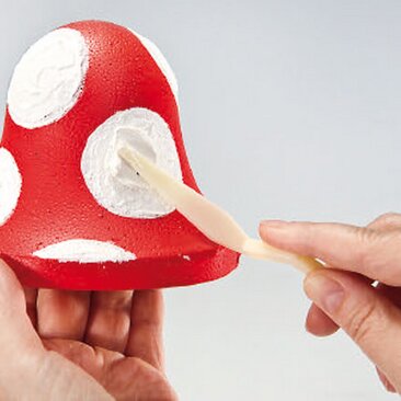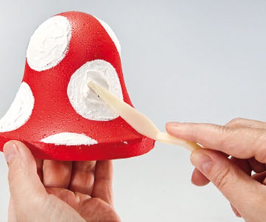 Polystyrenové zvonky natřeme zvenku červenou barvou a zevnitř béžovou barvou. Poté se na zaschlou barvu namalují bílé tečky houbiček a po zaschnutí se natřou jemnou strukturovací pastou.