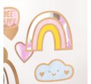 Buďte kreativní a vyrobte si s touto sadou krásné obrázky na okna. Motivy z kraftového papíru jsou předem vystřižené a mají velikost motivu přibližně 2,7 x 2,7 cm - 21,0 x 20,2 cm. To znamená, že není třeba zdlouhavě vystřihovat. Sada obsahuje 14 motivů ve tvaru duhy, mraku, jednorožce, želvy, medúzy, rakety, planety, včely, květiny, srdce a hvězdy. Pro každého se zaručeně najde ten správný motiv. Každý ze 14 motivů je obsažen dvakrát. Motivy si můžete přizpůsobit pomocí přiloženého obtiskového papíru a duhových fólií .