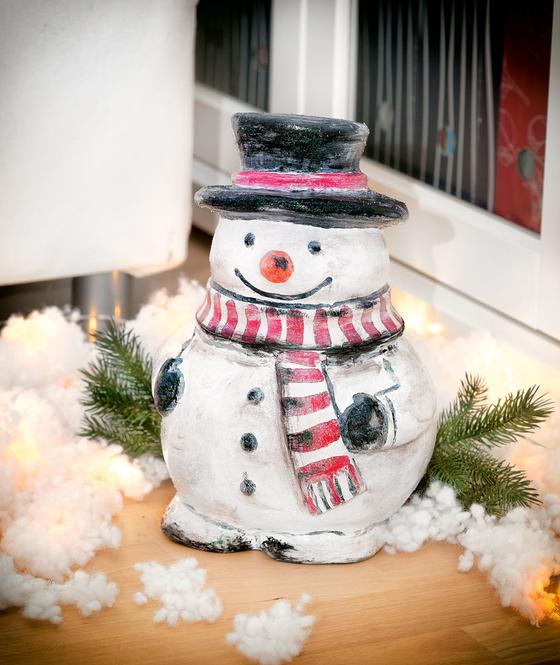 Pro ošuntělý vzhled sněhuláka lehce přetřete červenohnědou barvou a zvýrazněte černou barvou.