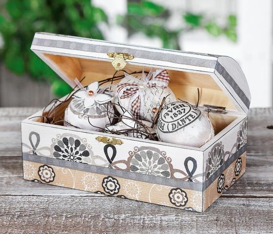 Zatímco barva zasychá, vystřihněte jednotlivé motivy a okraje ubrousků a odstraňte dvě vrstvy bílého papíru. Potisknuté vrstvy nalepte na truhlu a vajíčka pomocí laku na ubrousky. Použijte k tomu štětec na ubrousky VBS, protože umožňuje dokonalé nanesení barvy a minimalizuje riziko vzniku záhybů nebo prasklin v motivu. Chcete-li zvýraznit okraje truhly a rozsypaných dílků, natřete je přímo štětcem s inkoustovým polštářkem nebo použijte vatovou tyčinku či papírovou utěrku, abyste nabrali barvu a otřeli ji podél okrajů.