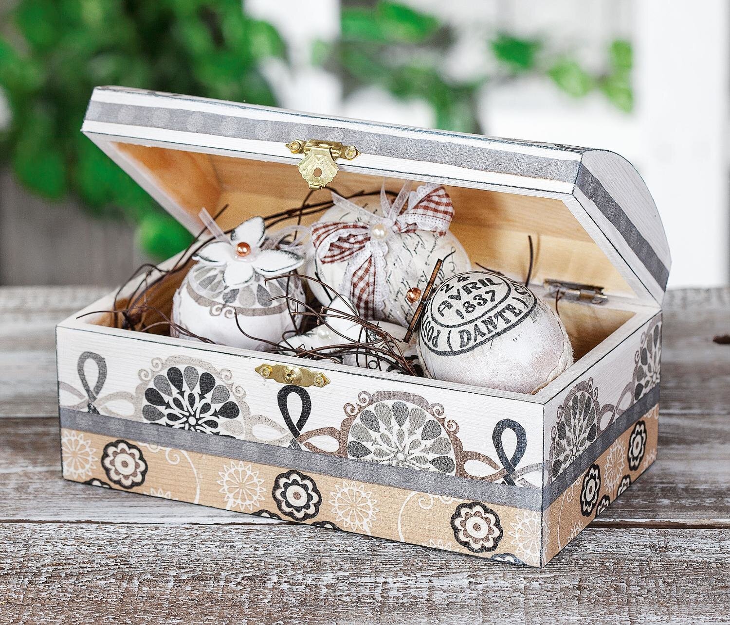Na terakotová vajíčka nalepte paličkovanou krajku, rozsypané kousky, šachovnicovou a organzovou stuhu podle potřeby a na závěr je ozdobte skleněnými voskovými perličkami. Poté, co dřevěnou truhlu vycpete ozdobnou vrbou, můžete do ní vajíčka ozdobně naaranžovat.