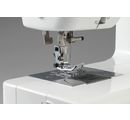 Uzamykatelná přítlačná patka: Přítlačnou patku lze uzamknout stisknutím tlačítka. Je zabráněno obvyklému naklápění přítlačné patky a ta přejíždí vodorovně a rovnoměrně přes vrstvy látek různé tloušťky a silné okraje lemů.