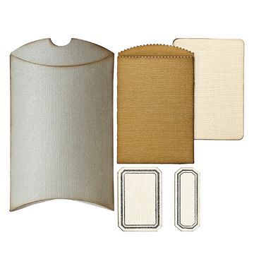 Vytvořte si vlastní obálky a štítky pomocí Sizzix Thinlits Výseková šablona "Pillow Box + Bag by Tim Holtz"! Sada obsahuje 5 kusů šablon a je vyrobena z kovu. Pomocí této vykrajovací šablony můžete vykrojit dárkovou krabičku a obálku se štítky. Hotové vysekávané díly mají velikost motivu v rozmezí 12,7 x 9,8 cm - 13,3 x 10,5 cm.