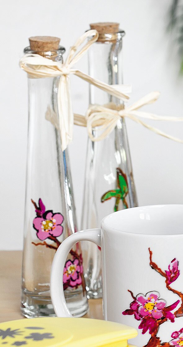 Barvy zapečte v troubě při teplotě 160 °C po dobu 30 minut, abyste je mohli mýt v myčce na nádobí, a lahvičky vás budou těšit po dlouhou dobu. Lahve ozdobte rafií.