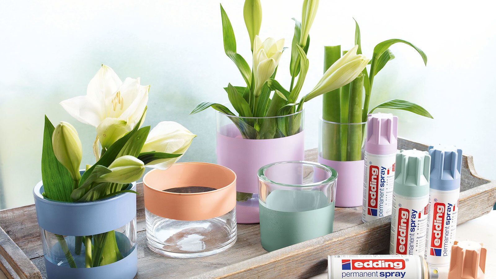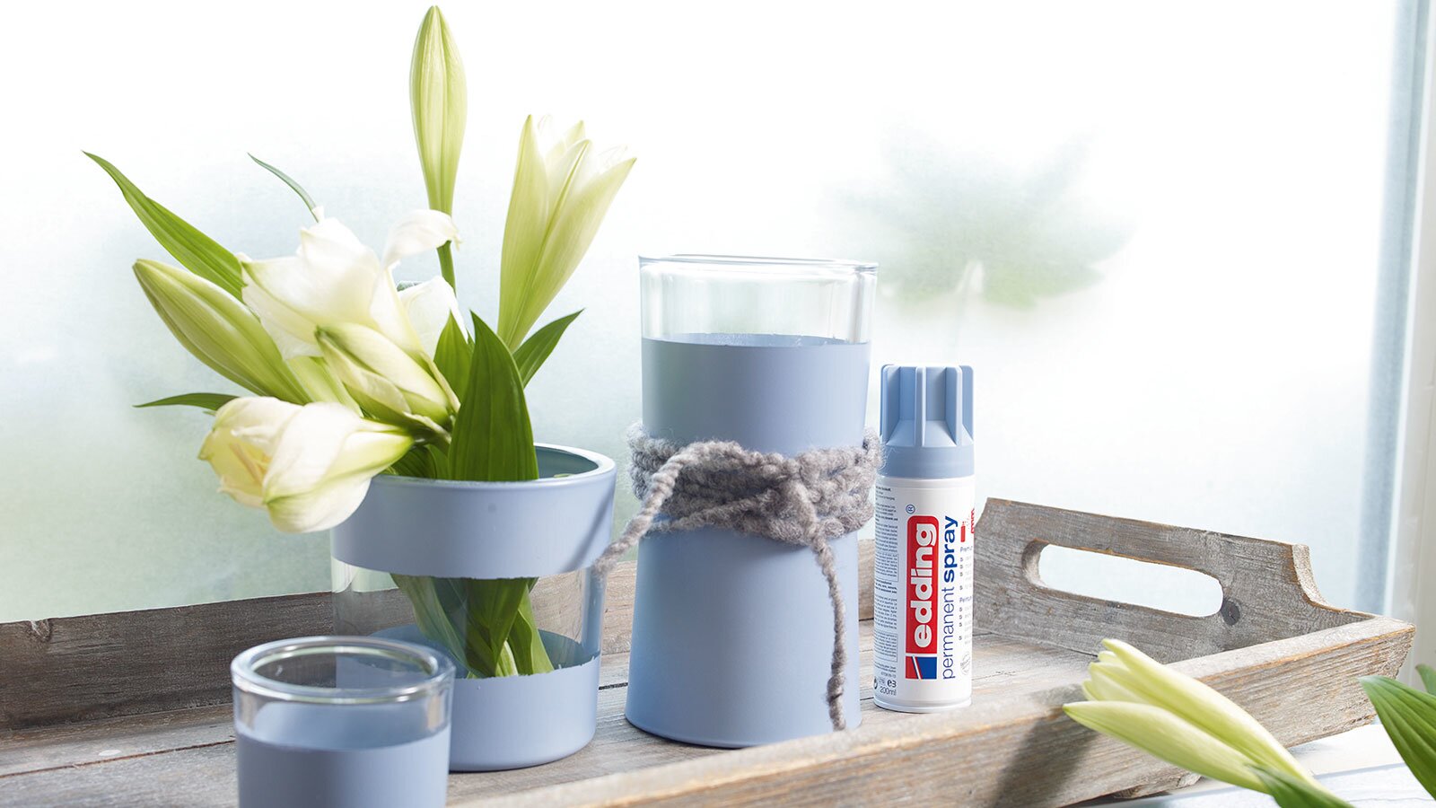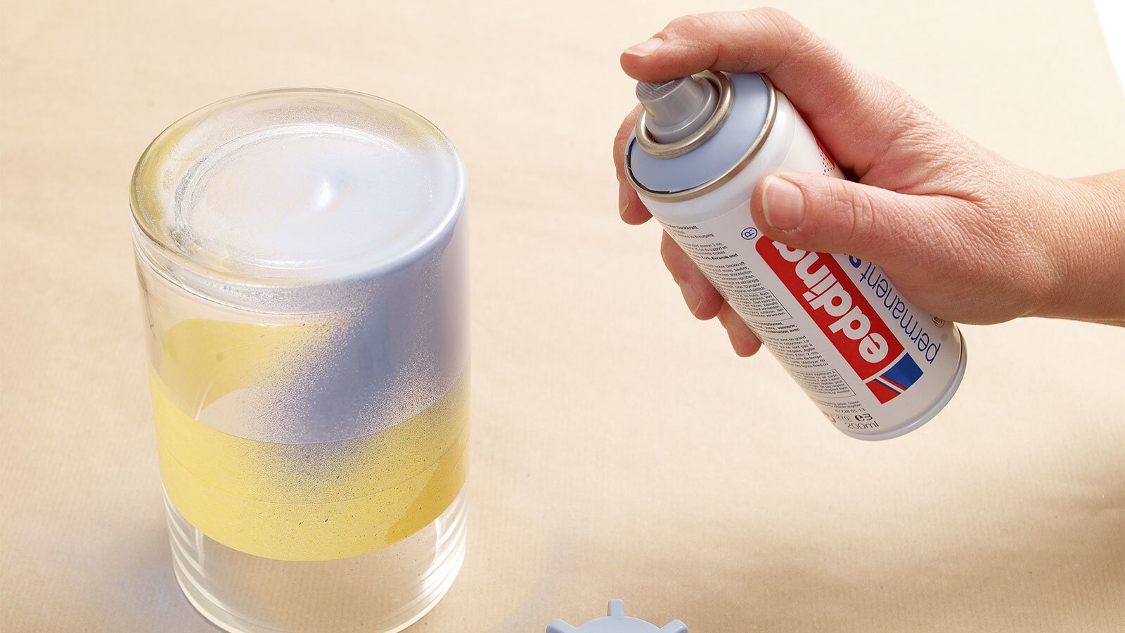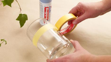 Nejprve byste se měli ujistit, že je skleněná váza suchá, čistá a bez zbytků mastnoty. Vázu přelepte lepicí páskou v místech, kam se nesmí dostat barva. V našem případě jsme se rozhodli pro pásky různých barev. Jakmile si vyberete barvu permanentního spreje Edding, otočte vázu dnem vzhůru a rovnoměrně a v lehkých vrstvách ji nastříkejte křížem, abyste dosáhli rovnoměrného výsledku.