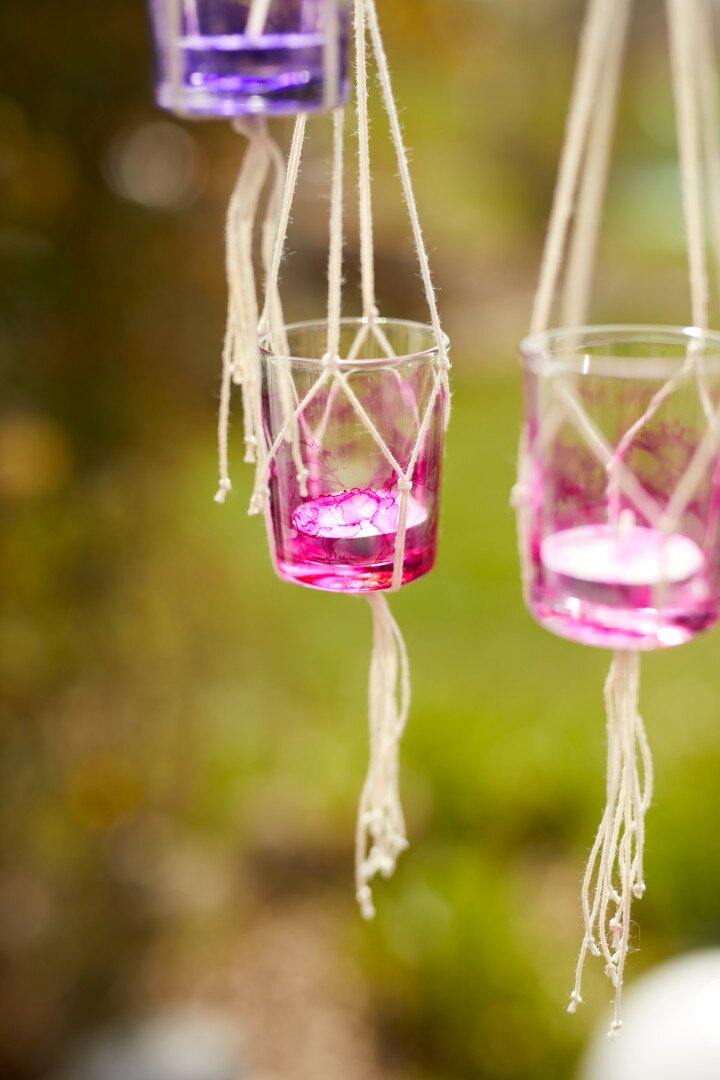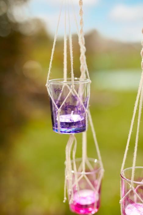 Nakonec odstraňte lepicí proužky, kterými jste na začátku zajistili sklenici s čajovou svíčkou. Stejným způsobem uvažte i ostatní závěsy skleniček na čajové svíčky.