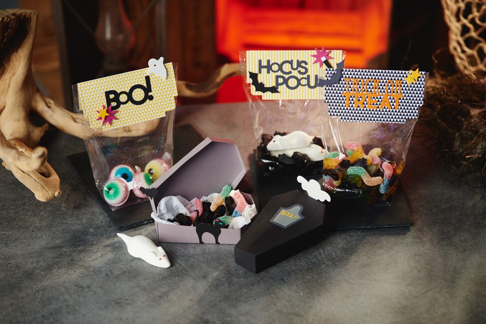 Zabalte své strašidelné sladkosti podle halloweenského hesla "sladké nebo kyselé" do strašidelně krásných dárků, jako je rakev, nebo do sáčků s odpovídajícími nápisy.