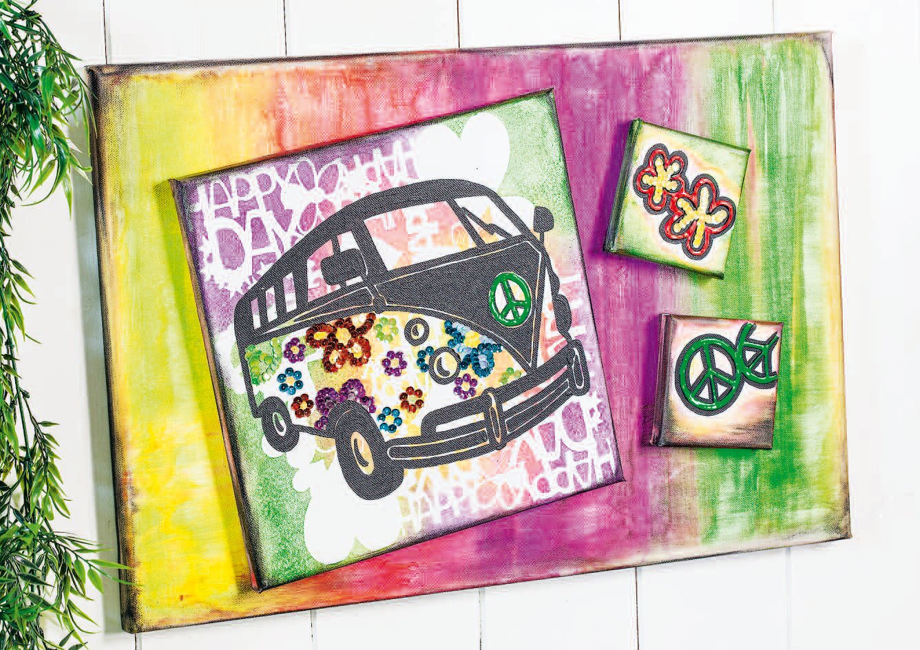 Šablonu autobusu lze nyní přenést na čtvercový nosný rám. Jakmile jsou tvary autobusu natřeny černou barvou, máte skvělý základ pro zbytek obrázku Flower Power: barevné květiny a motiv míru se nanesou na malé nosné rámečky pomocí efektové linky a autobusu dodá jistotu středový znak míru. Jakmile vše zaschne, lze kolem motivů na malých nosných rámečcích nakreslit další černé kontury a podle chuti přidat barevné stínování.
