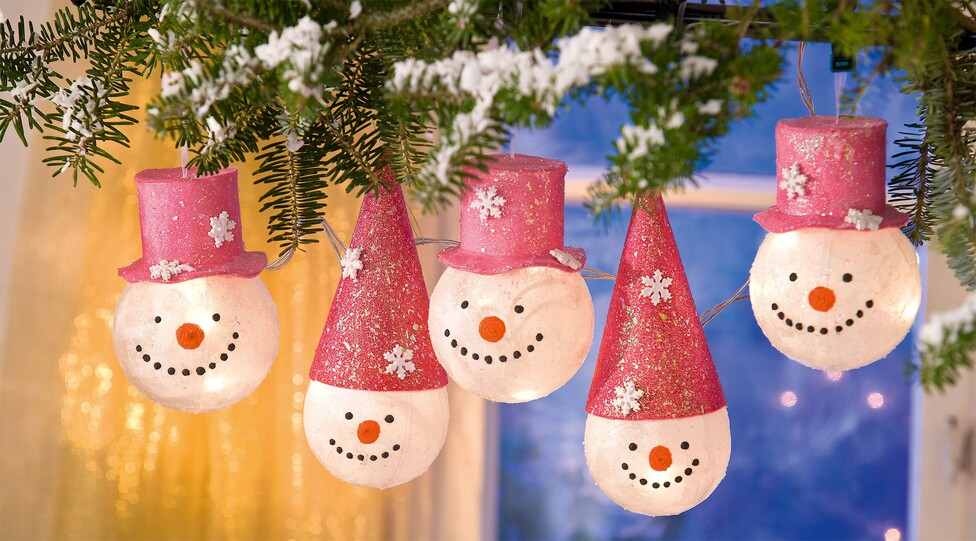 Kloboučky a baňky potřete třpytivou pastou a nechte důkladně zaschnout, poté přilepte sněhové vločky.