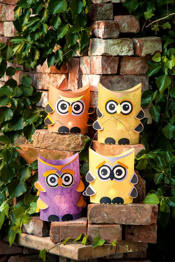 Skalpelem vyřízněte uprostřed základny lucerny malé štěrbiny, prostrčte jimi kolíčky držáků na čajové svíčky a ohněte je. Pomocí lepicí pásky přilepte kolem podstavců lampionů fólie s popisky.