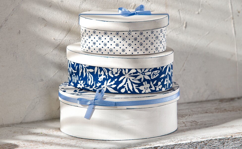 Začněte tím, že krabičky a víčka natřete bílou barvou. Poté z ubrousku vystřihněte požadované okraje a odstraňte dvě nepotištěné vrstvy papíru. Potisknutou vrstvu papíru zezadu nastříkejte lepidlem ve spreji a umístěte ji přesně podél spodního okraje kolem krabiček a na víko. Pokud se to napoprvé nepodaří, ubrousek opatrně odstraňte a znovu jej umístěte. Opatrně vyhlaďte tenký papír a poté naneste lak na ubrousky zevnitř ven. Po zaschnutí jednoduše odřízněte přebytečný papír podél okrajů skalpelem.