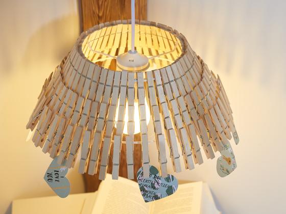 Chcete-li vyrobit stínidlo, nejprve umístěte kroužek lampy na misku s rostlinami. Nyní ke kroužku jednou po celém obvodu připevněte svorky. Poté připevněte další řadu sponek ke sponkám v první řadě. Ve třetí řadě přilepte za tepla rukojeť svorek k rukojeti svorek ve druhé řadě, abyste je mohli otevřít a něco na ně zavěsit.