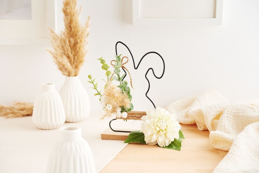 Několikrát omotejte jutovou stuhu kolem bříška zajíčka tak, aby byla pevně utažená, a konec stuhy přilepte horkým lepidlem. Při omotávání dbejte na to, aby byla stuha rovnoměrně rozložená. Rostliny, sušené květiny nebo čerstvé větvičky zastřihněte tak, aby se vešly do stuhy.