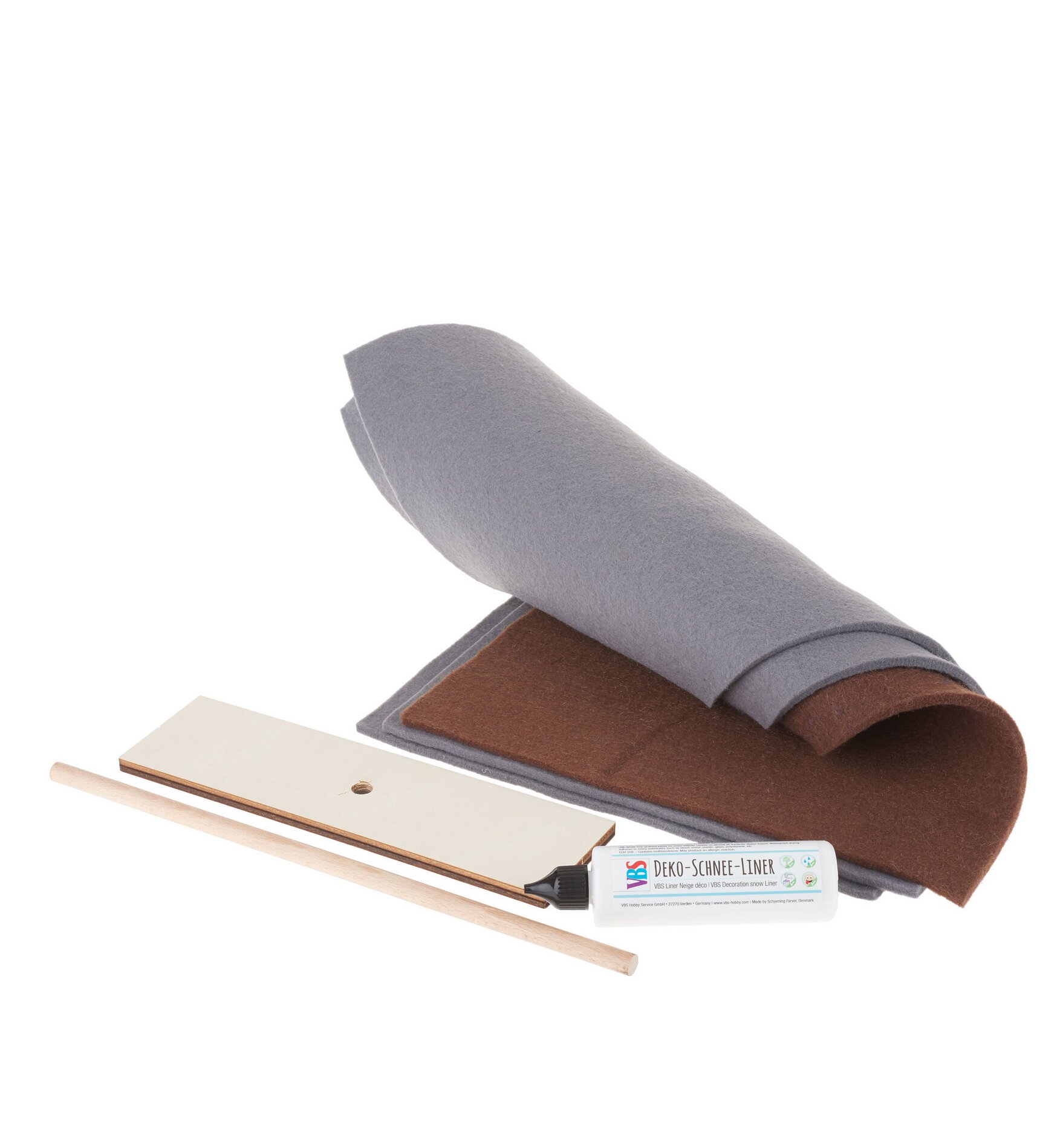 ozdobnou sněhovou vložkou. Obzvlášť zábavné je vybarvování sněhových obrysů. Poté slepte oba kusy jedlové plsti na okrajích k sobě a plstěný obal jednoduše přilepte na dřevěný stojan.