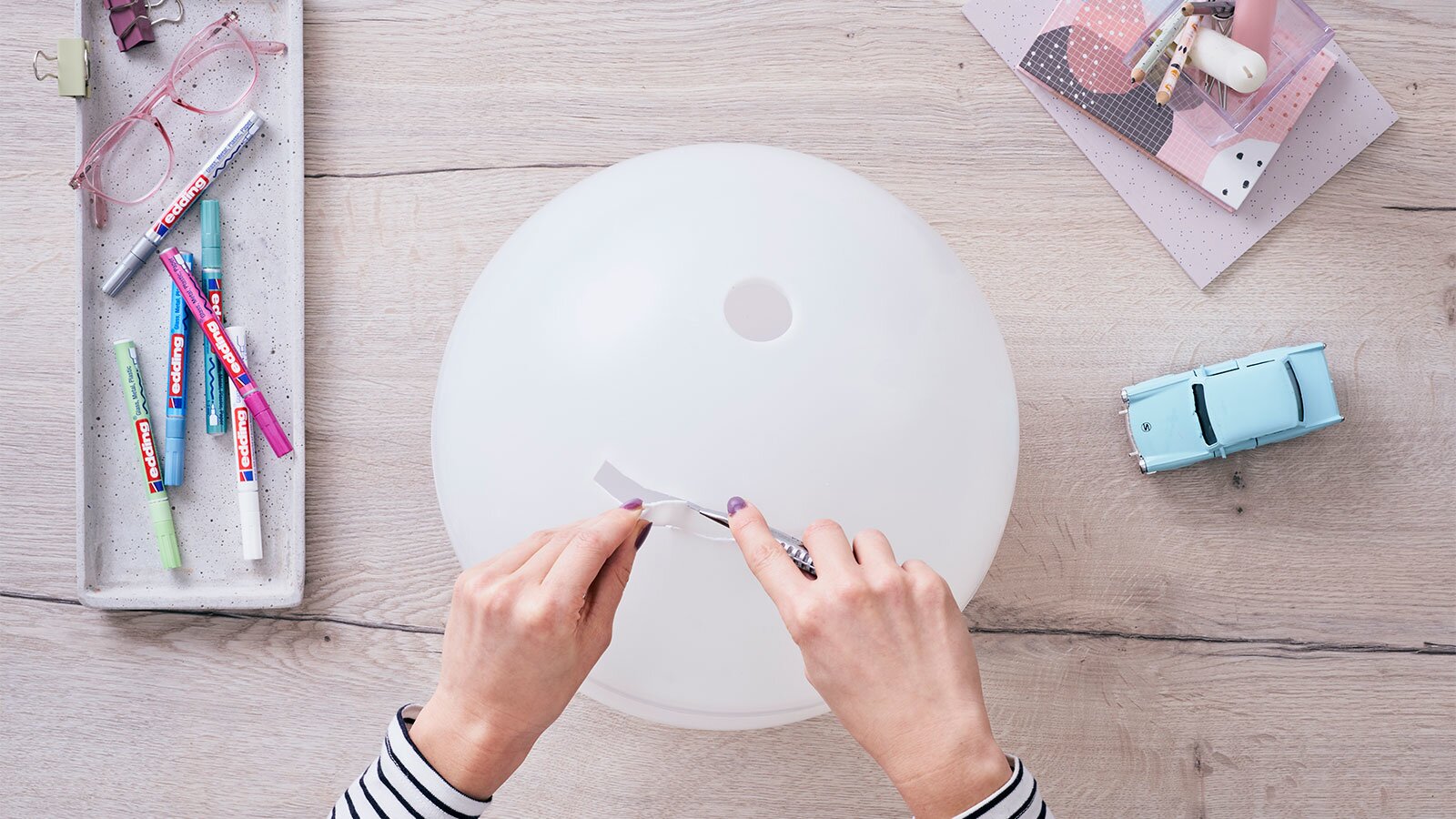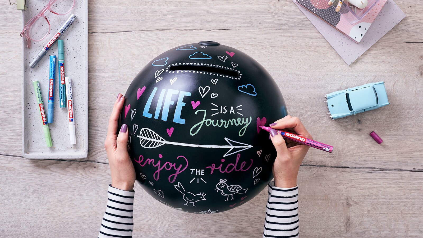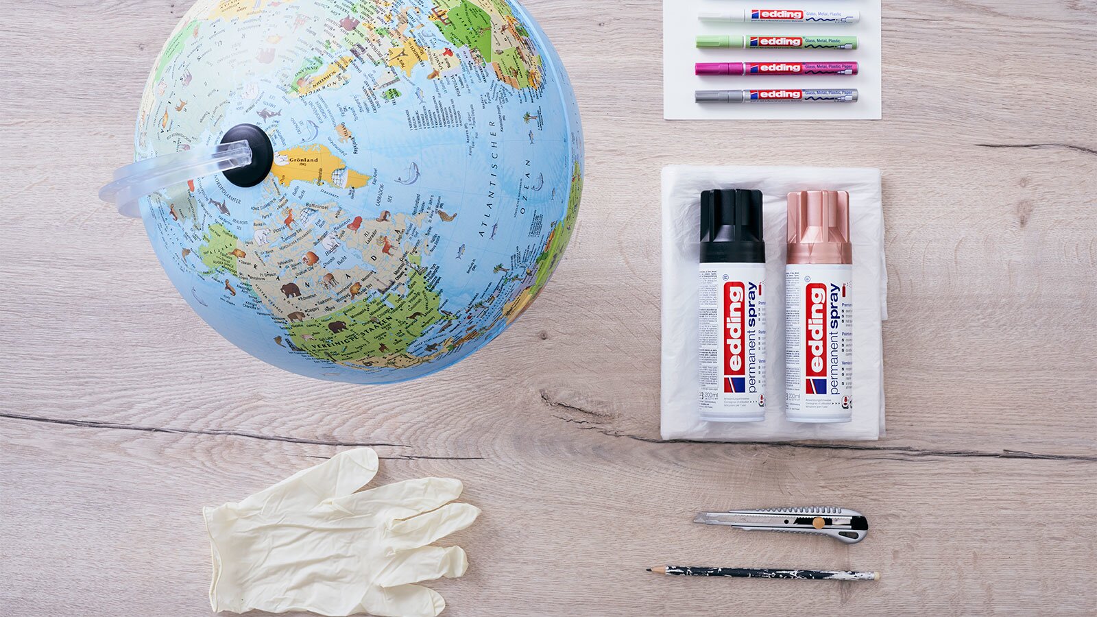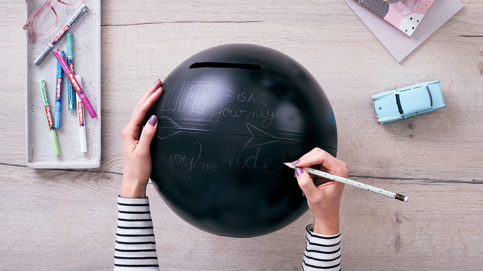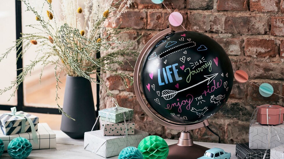 Svatba je začátkem cesty novou životní etapou. Proměnili jsme zeměkouli ve společníka a vykouzlili dokonalý svatební dar. Je to tak snadné: dodejte glóbusu nový vzhled pomocí permanentního spreje edding a navrhněte si ho podle svého gusta pomocí lesklých fixů. Pokud do glóbu vyříznete štěrbinu, získáte také atraktivní pokladničku na svatební stůl, kam mohou hosté vkládat své peněžní dary. Permanentní sprej okamžitě kryje a má krátkou dobu schnutí, takže se můžete velmi rychle pustit do skutečného barevného provedení. Globus můžete ozdobit nejrůznějšími motivy: Vhodné jsou svatební symboly, pozdravy, přání a mnoho dalšího, které lze snadno realizovat pomocí lesklých fixů. Na černém pozadí se krycí barvy připomínající lak opravdu vyjímají. Popisovače nabízíme v různých šířkách čar, od 0,8 mm pro velmi jemné kresby až po 4 mm, pokud chcete nanášet silné barvy.