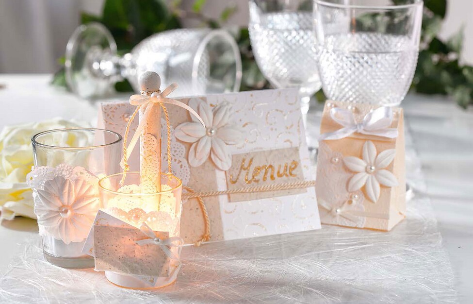 Z dárkového sáčku odstraňte stuhu, aby se lépe maloval. Sáček pomalujte malířskou houbičkou v barvě slonové kosti. Nechte zaschnout a ozdobte krajkovým papírem, saténovou stuhou, papírovými květy a půlperlami. Opět navlékněte mašli. Kolem skleničky na čajovou svíčku připevněte páskou proužek přírodního papíru. Krajkový papír rozstřihněte na polovinu a přilepte lepicí tyčinkou. Z reliéfního kartonu a přírodního papíru vystřihněte dva obdélníky. Reliéf zvýrazněte třpytivým linerem. Přilepte na sklenici. Kolíček na šaty natřete barvou slonové kosti a nalepte na něj kousek krajkového papíru pomocí lepicí tyčinky. "Krk" sponky omotejte šňůrkou a sponku a skleničku ozdobte mašlí a perlou. Z reliéfního kartonu vystřihněte kousek o rozměrech 15 x 21 cm na jídelní lístek a menší kousek na kroužek na ubrousky a reliéf zvýrazněte třpytivou vložkou. Přeložte kartu a přilepte kroužek na ubrousek pomocí lepicí pásky. Polovinu karty polepte nenatíraným papírem a obdélníkový kousek nenatíraného papíru označte třpytivou vložkou a také jej přilepte. Krajkový papír nastříhejte na požadovanou velikost a nalepte na přírodní papír. Kolem kroužku na ubrousky nalepte proužek přírodního papíru. Obojí ozdobte papírovými květy a půlperlami. Přáníčko ozdobte lesklou šňůrkou a kroužek na ubrousky saténovou mašlí.