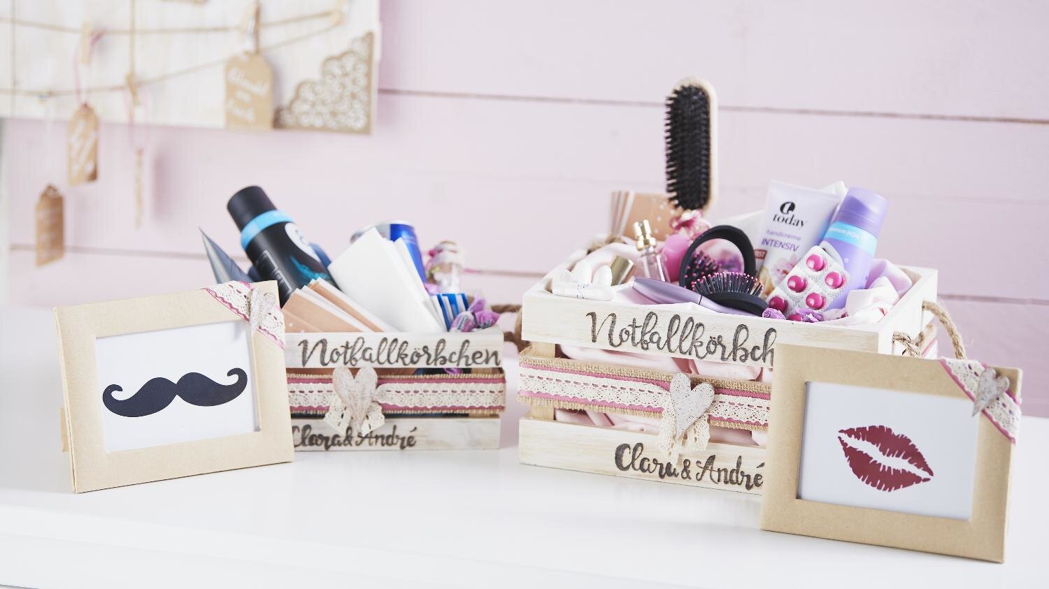 Nouzová schránka pro nevěstu je natřena křídovou barvou a pomocí stírací houbičky získává ošuntělý vzhled. Jako dekorace je použita také stužková obruba s ozdobným srdíčkem. Náplň