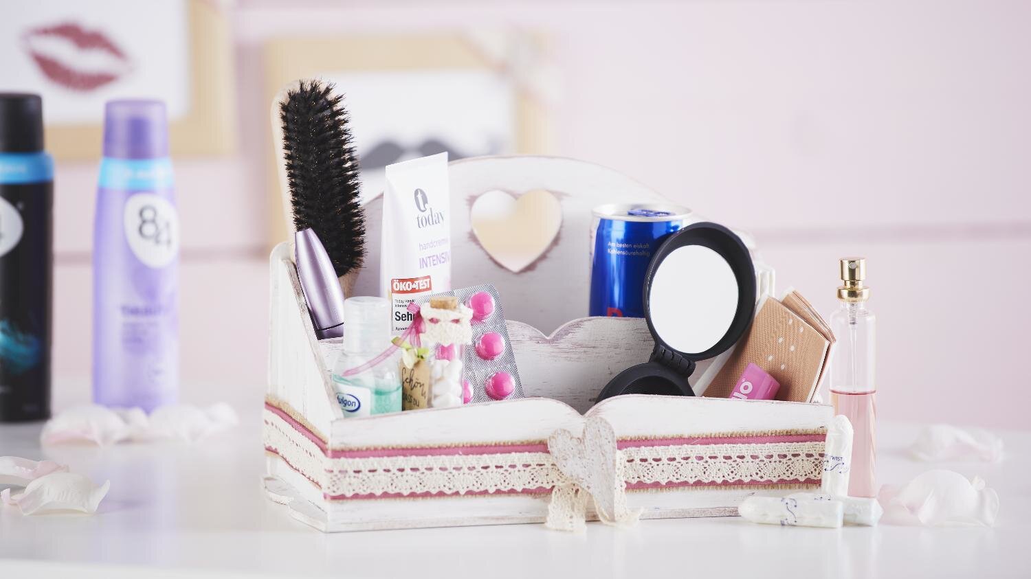 Košík pro dámy může obsahovat o něco více - krémy na ruce, tablety proti bolesti hlavy, řasenku, tampony, pilník na nehty..