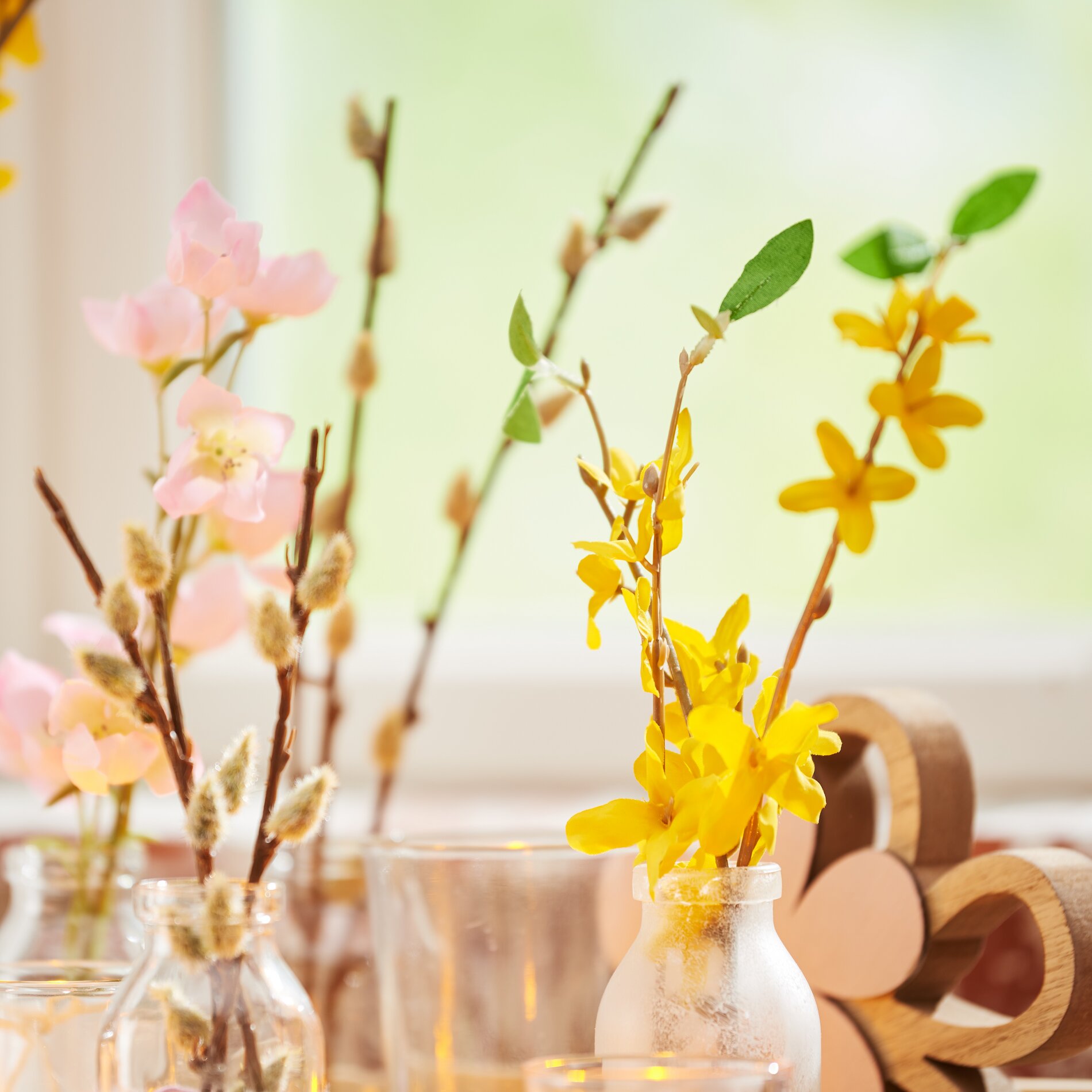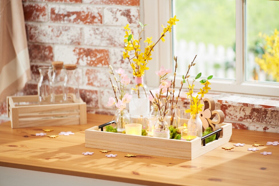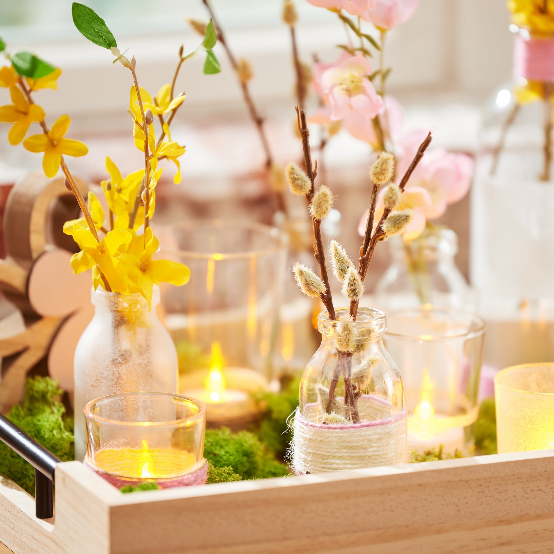 Vázy naplňte trochou barevného písku (pro pevnější stojan). Umělé květiny ořízněte bočním řezákem a umístěte je do váz. Do sklenic na čajové svíčky vložte čajové svíčky a vše naaranžujte na tác.