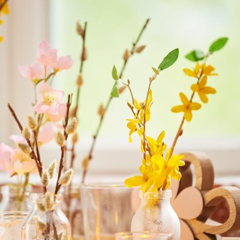 Zatímco barva na dřevěné květině zasychá, můžete sklenice a láhve ozvláštnit buď omotáním jutovou stuhou a řemeslným lepidlem, nebo je natřít barvou s mrazivým efektem.