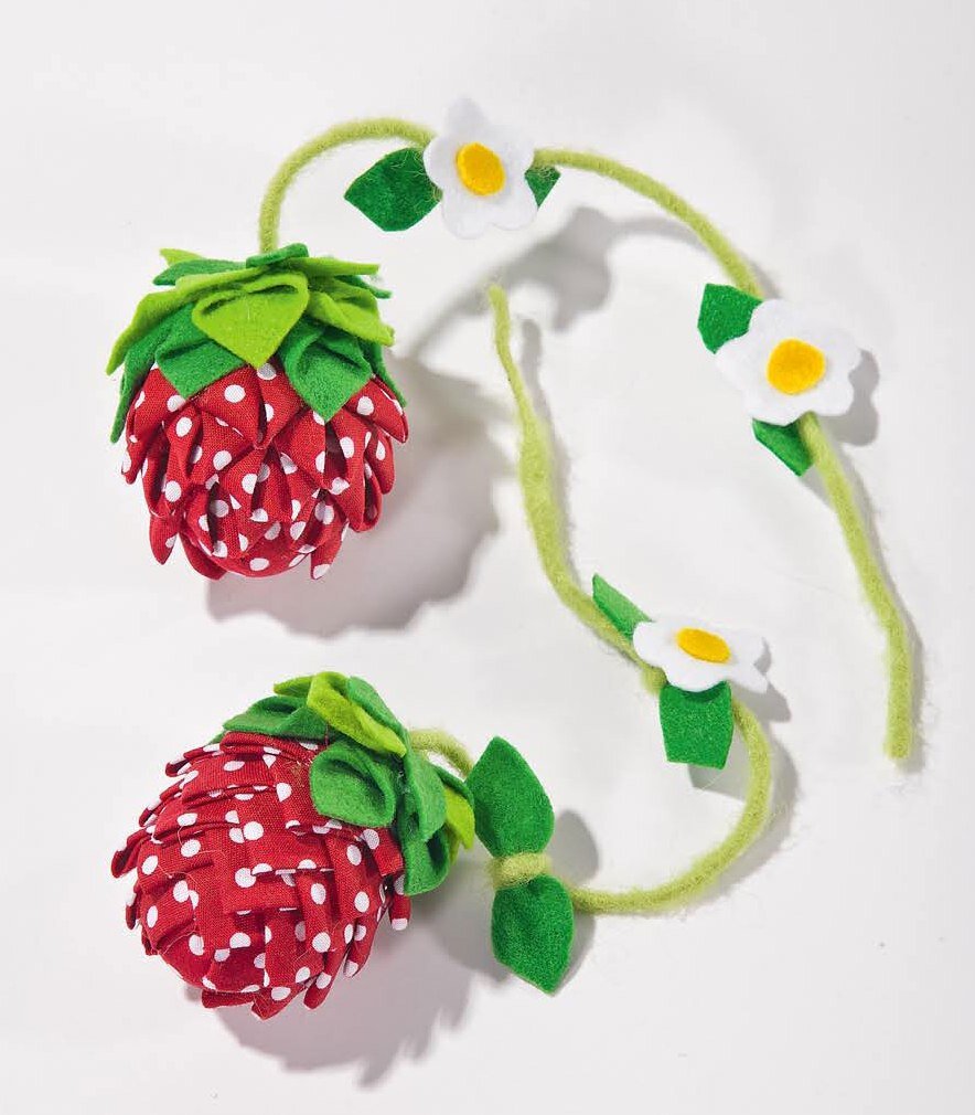 K jahodě (stonku) připněte kousek vlněné šňůrky. Poté vystřihněte květy a pestíky z bílé a žluté plsti a malé lístky ze zelené plsti. Ty nakonec připevněte k provázku pomocí tavné lepicí pistole.