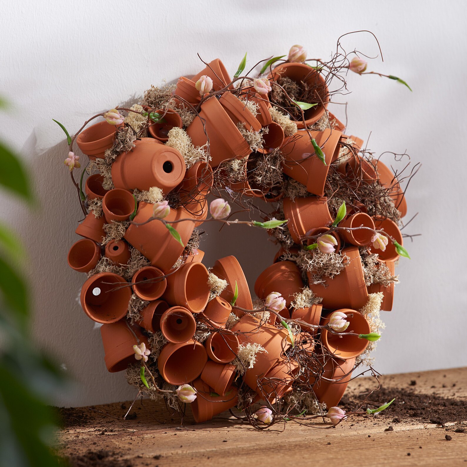 Základem našeho nápadu je polystyrenový kruh o průměru 20 cm. K výrobě budete potřebovat terakotové květináče různých velikostí, včetně střepů. Ty přilepte na věnec pomocí tavné lepicí pistole tak, aby byla pokryta téměř celá plocha věnce.