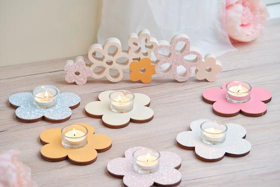 Namalujte držák na čajovou svíčku "Flower" v různých slunečných barvách: Žlutá, tmavě růžová, slonová kost, májově zelená a meruňková.