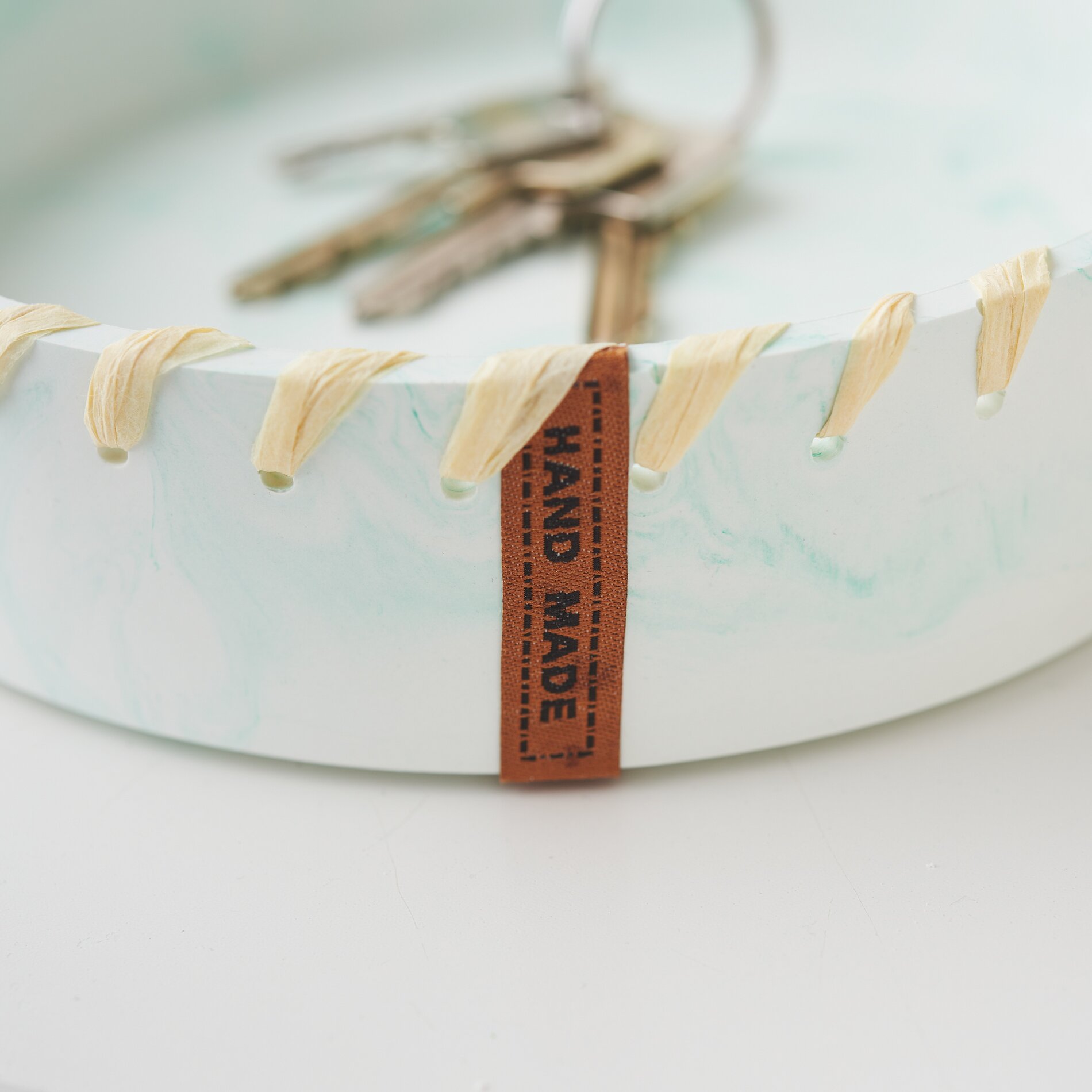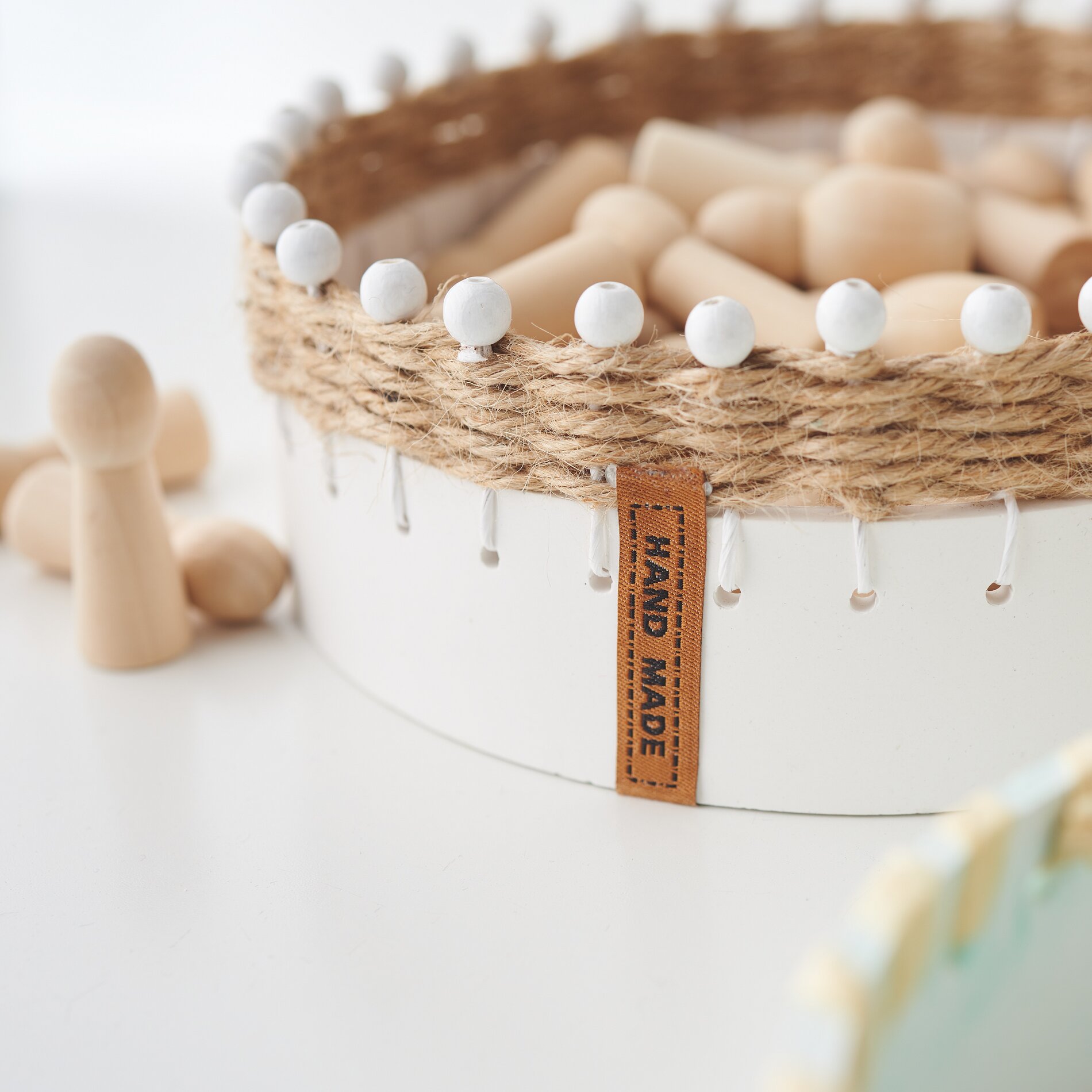 3. Závěrečné úpravy pomocí korálků a štítků Na závěr můžete na konce drátků přilepit dřevěný korálek nebo drátek jednoduše ohnout dovnitř. Jako osobní doplněk použijte ručně vyrobený štítek. Můžete jej k misce připevnit pomocí řemeslného lepidla.