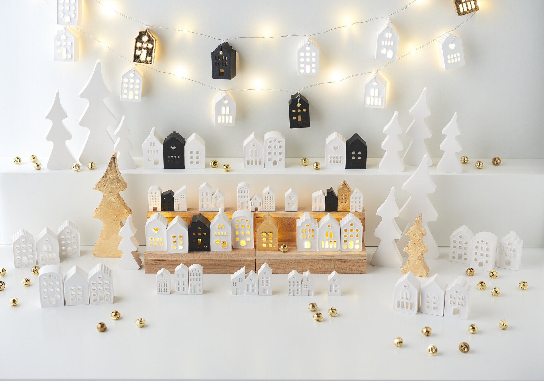 Po zaschnutí lepidla můžete na zadní stranu podesty pomocí horkého lepidla připevnit světelný řetěz. Nakonec umístěte domečky na podstavec podle libosti, přičemž větší domečky můžete zevnitř osvětlit světelnými koulemi.