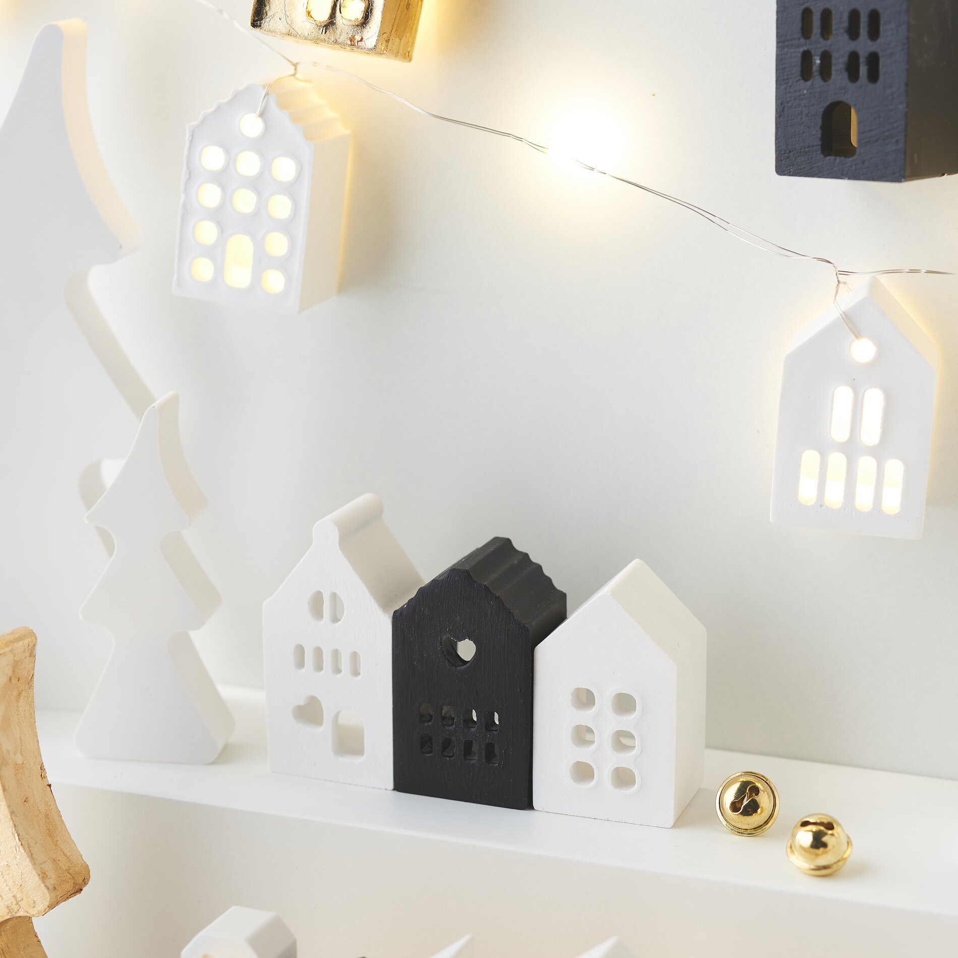 Atmosférické zvýraznění vytvoříte tak, že do miniaturní krajiny přidáte řetěz světelných domků. Provlékněte pohádková světla horními okny domku a protáhněte je až k poslednímu světlu. Konce řetězu stočte k sobě, aby pevně držely. Tento postup opakujte pro každý dům, který chcete ve svém souboru osvětlit.