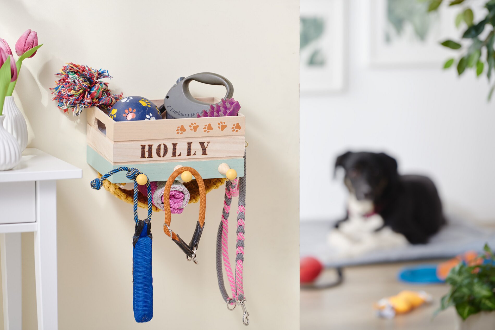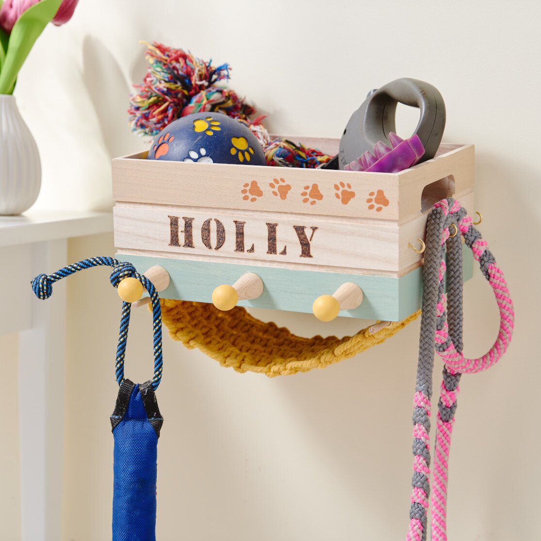 Do spodní části krabičky přišroubujte další 4 háčky a do zadní části přišroubujte závěsy. Nakonec zavěste kulaté tyče do spodních háčků a připevněte organizér na zeď. Nyní je připraven k naplnění a zavěšení.