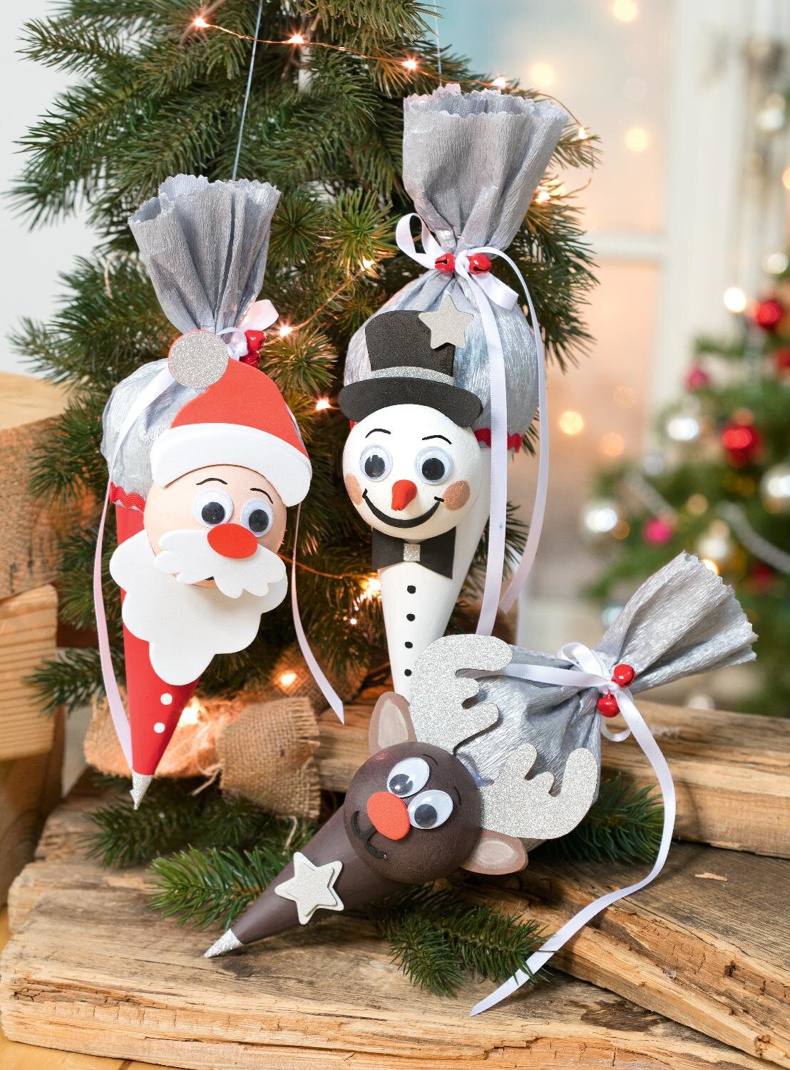 Špičku sáčku pokryjeme třpytivou fólií, obličej k sáčku připevníme horkým lepidlem a malými bílými "knoflíky" pomalujeme bílou linerkou.