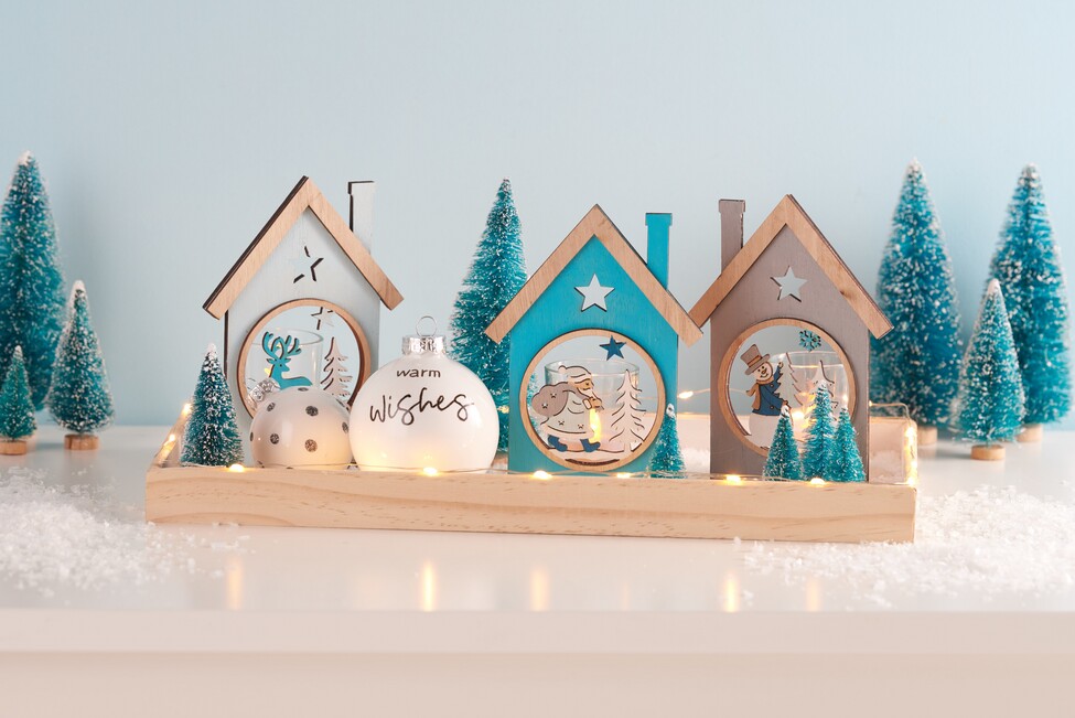 2. Nyní umístěte domečky na tác. Můžete je také připevnit na místo pomocí trochy řemeslného lepidla nebo horkého lepidla. Poté připevněte jedličky na tác pomocí trochy horkého lepidla.