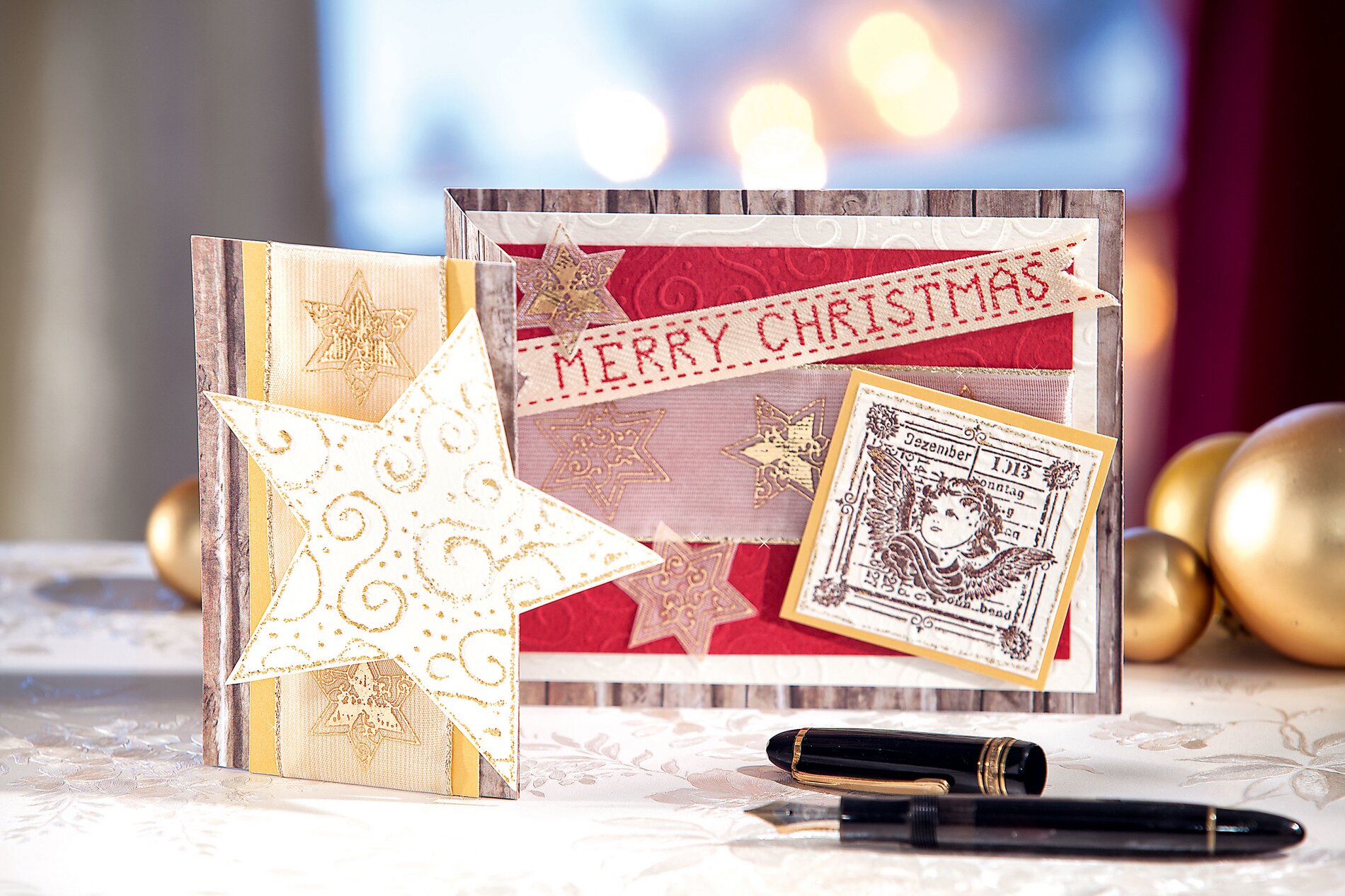 Na přední stranu nalepte proužek zlaté fotokarty, položte na něj stuhu a připevněte ji k zadní straně pomocí pásky. Přeneste hvězdu z listu šablony na embosovací kartu a vystřihněte ji. Embosování hvězdy zvýrazněte třpytivým linerem. Hvězdu nalepte pomocí 3D lepicích polštářků.