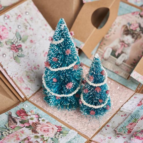 Obzvláště efektní jsou dvě zdobené jedličky uprostřed krabice. Za tímto účelem odřízněte nožičky jedliček pomocí bočního řezáku. Na stromky přilepte jednotlivé květy Glixia a poté je ozdobte rokajlem navlečeným na drátku.