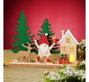 V pozadí jsou vidět dva vánoční stromky a domeček, zatímco v popředí vytváří atmosférickou scénu roztomilý jelen, slavnostní skřítek a dárky. S výškou 19 cm a délkou 24 cm je tento motiv na zatlačení ideální na stůl, poličku nebo okenní parapet.