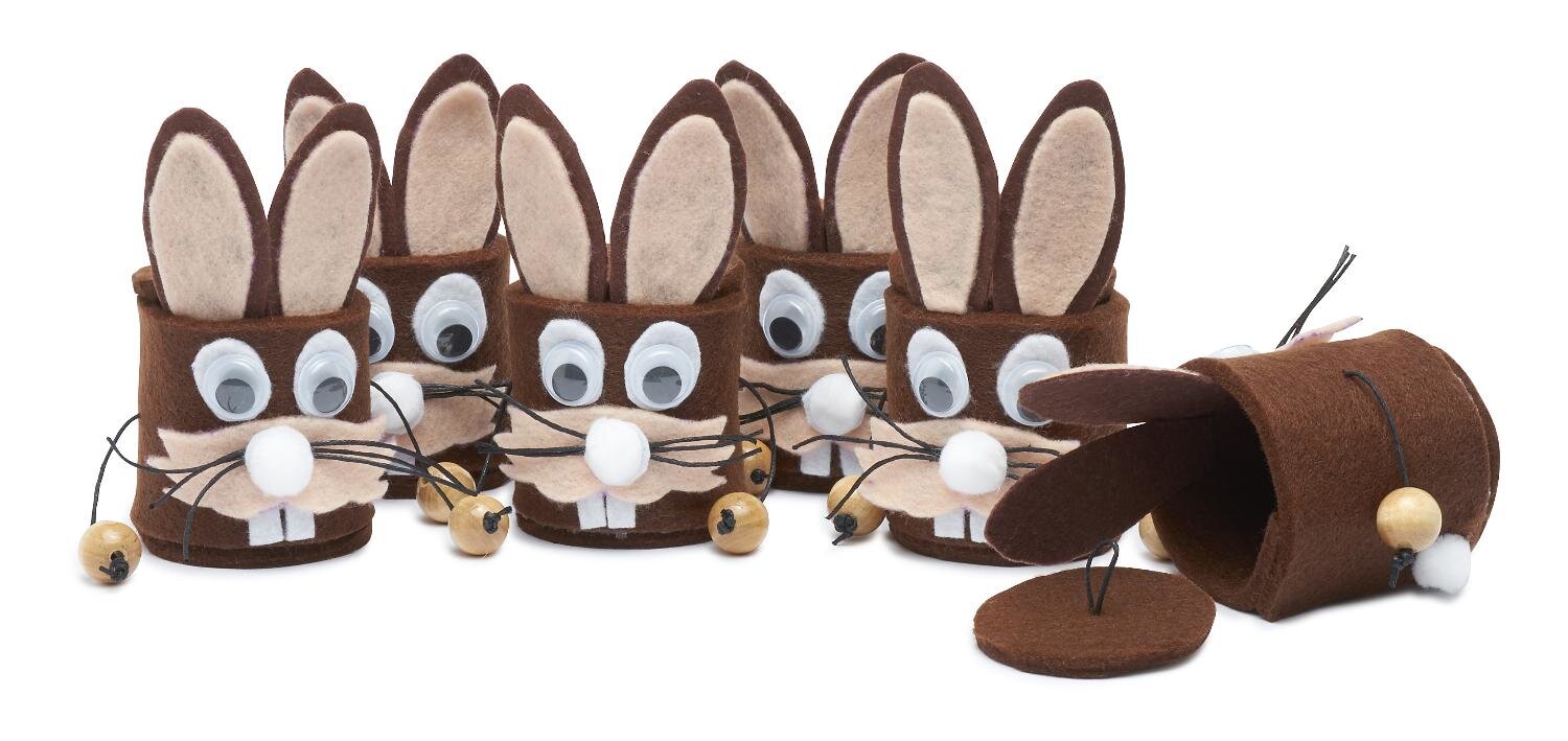 Nejprve slepte tělo na úzkých okrajích a poté připevněte základnu. Uši jsou vyrobeny z hnědé plsti v barvě kůže. Menší kousek ucha v barvě kůže přilepte na hnědé zaječí ucho. Nyní přilepte lžičky do vajíčkové útulny.