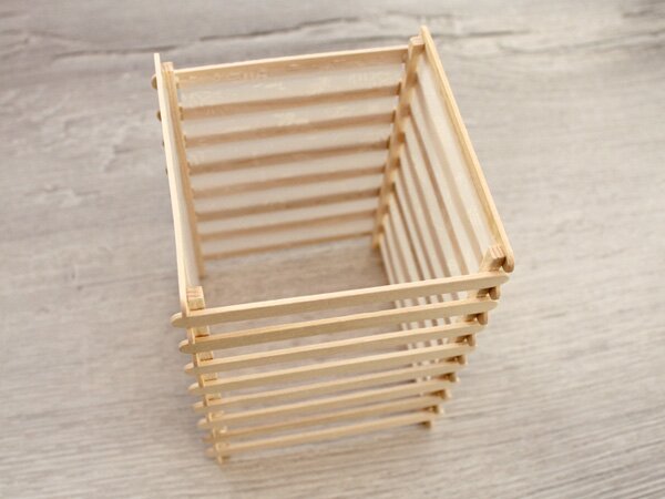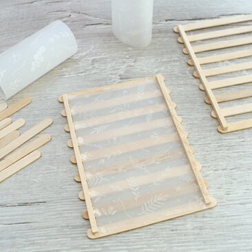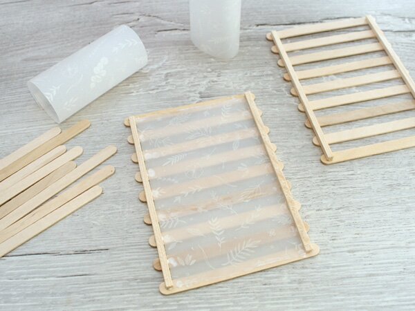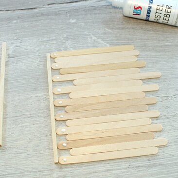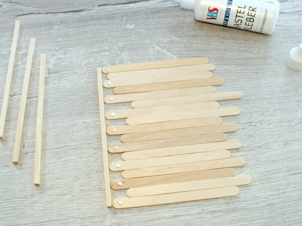 Poté položte dřevěné tyčky k sobě a každou druhou trochu posuňte. Poté na tyčky přilepte dva kusy čtvercové lišty a nechte mezi nimi trochu místa.