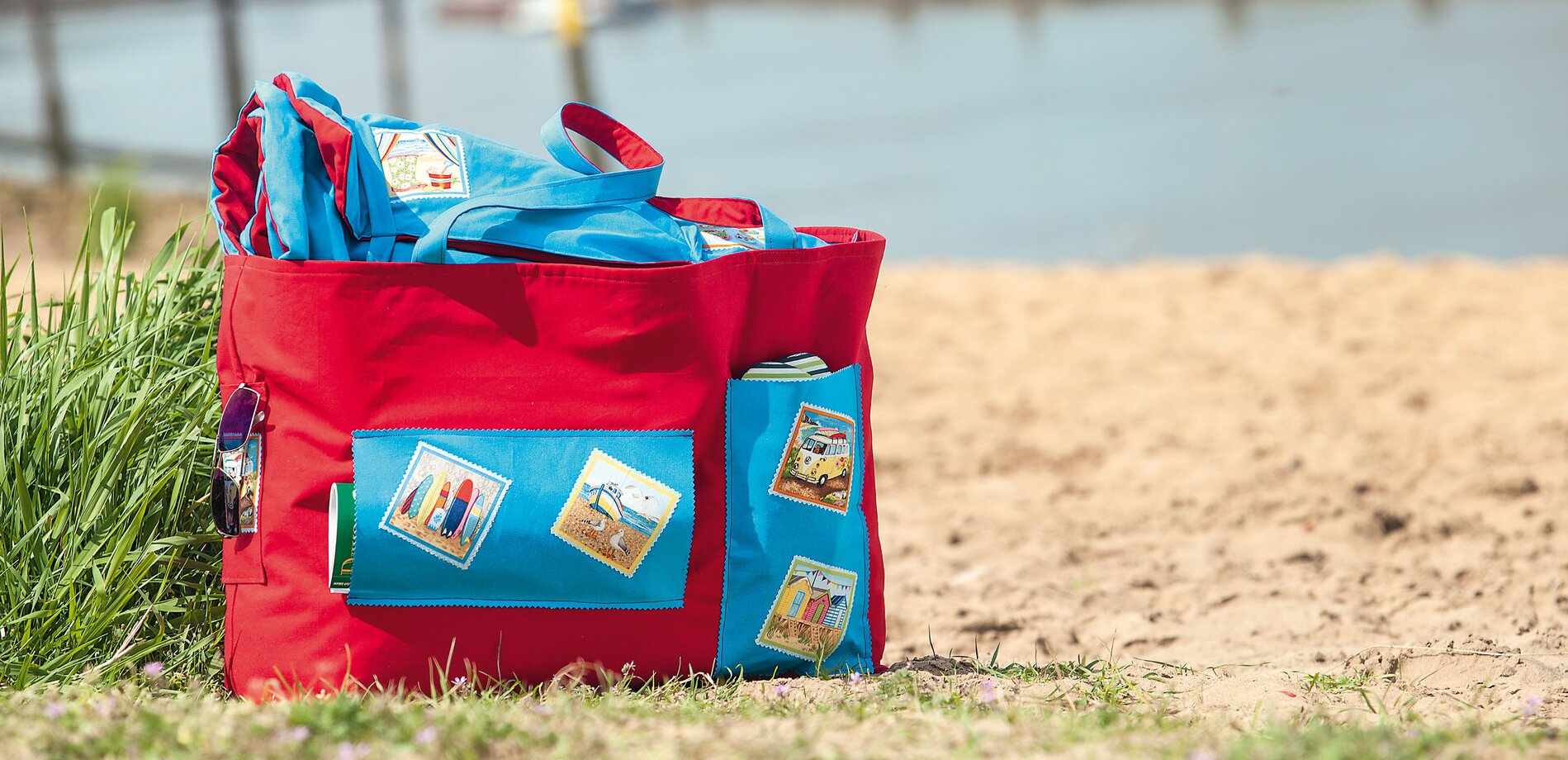 Látku na malé kapsy, které budou přišity na vnější straně plážové tašky, nažehlete na Decovil, aby se stabilizovala, a poté ji pomocí nůžek na růžky ustřihněte na požadovanou velikost. Případně lze okraje také obháčkovat, abyste získali přesné okraje.