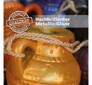 Metalické lesklé barvy lze nanášet plošně nebo technikou šablonování. Dekorativní předmět vypadá obzvlášť působivě, když jsou jeho hrany patinované. Zde se lehce přetřou druhou barvou, aby vznikl 3D efekt.